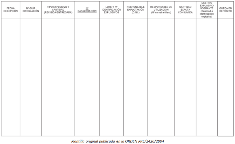 En la Disposición Segunda de esa ORDEN PRE, punto 1, se dice únicamente que debe llevarse un libro-registro específico en el que se deben consignar diariamente las entradas, salidas y existencias, así como los datos de identificación del material, del efectivamente consumido y del sobrante, y de todo el personal que ha intervenido en el proceso.