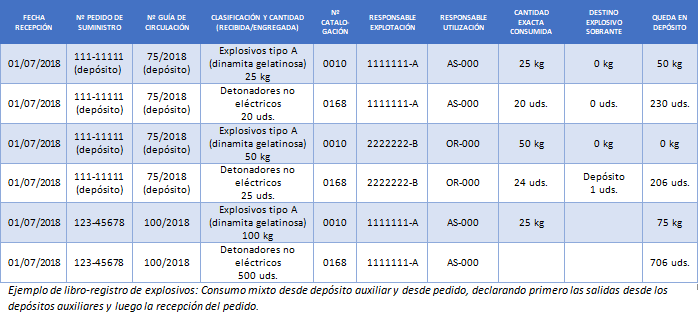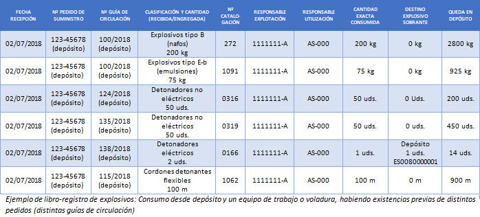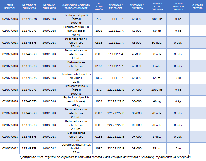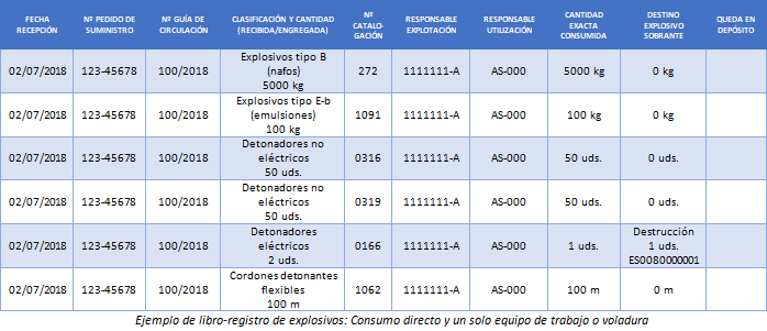 El caso más trivial es el consumo directo de un pedido completo en un único frente de voladura y en una obra o explotación en la que no hay depósito. En este caso, a excepción de lo mencionado, pocas dudas caben. Se crea una fila de datos por cada número de catalogación del pedido, teniendo todas en común la fecha de recepción, el número de pedido y de guía de circulación y, normalmente, también los responsables (sería extraño que se designaran diferentes responsables a diferentes productos, aunque en principio nada lo impide).