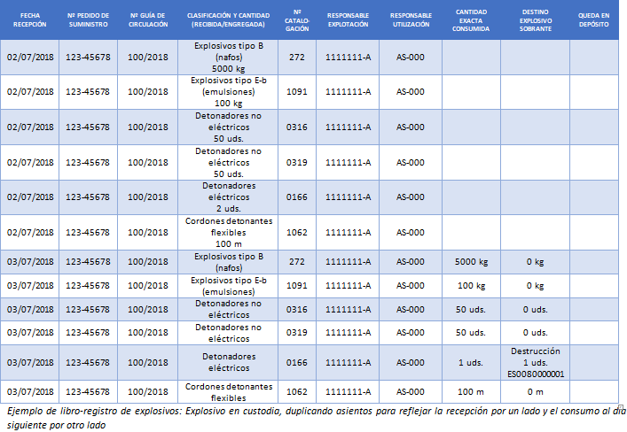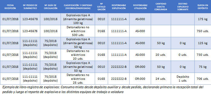 Si en la obra o explotación no hay depósito, es habitual dejar en blanco la última columna en aras de una mayor claridad. Si hubiera depósito pero no se hace uso de él en esa voladura, entonces sí se deben indicar las cantidades existentes. El siguiente ejemplo muestra una serie de asientos para este caso.