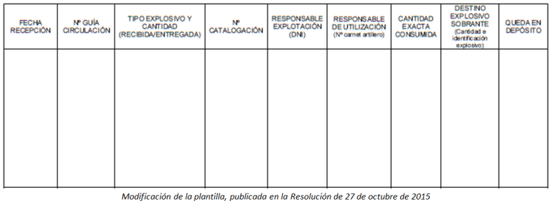 Años más tarde, en la Resolución de 27 de octubre de 2015 (publicada en el BOE el 23 de noviembre de 2015) conjunta de la Dirección General de la Guardia Civil y de la Dirección General de Política Energética y Minas, se modificaba el formato del Libro-registro de consumo suprimiendo la columna correspondiente al lote y número de identificación de los explosivos, pues con la puesta en marcha de la identificación única de cada producto y accesorio explosivo y sus movimientos dentro de la obra o explotación (trazabilidad), cubrir esa columna provocaba que cada asiento aumentara su tamaño de forma notable. Esto además resultaba particularmente engorroso en aquellas obras y explotaciones que usaran un sistema de trazabilidad que no fuera capaz de generar de forma automatizada la documentación.