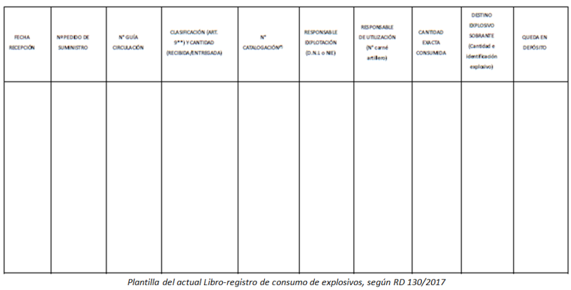 Con toda esta trayectoria, el 4 de marzo de 2017 se publica en el BOE el RD 130/2017, de 24 de febrero, por el que se aprueba el nuevo Reglamento de Explosivos (y el tercero desde 1978). Aunque la entrada en vigor de este Reglamento supuso y está suponiendo cambios importantes en algunos aspectos, lo cierto es que en lo relativo al Libro-registro de consumo las novedades han sido mínimas. Queda regulado por el artículo 122 y por la ITC número 24, en la que se puede consultar la nueva plantilla pero de nuevo sin apenas aclaraciones de cómo cumplimentar correctamente este documento.