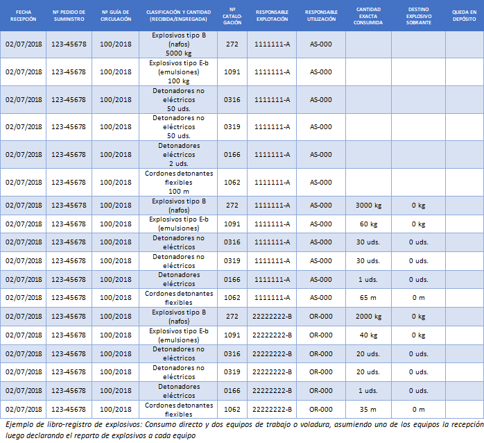 Debe caerse en la cuenta también que el caso de explosivo en custodia y el de consumo con procedencia mixta se complican mucho más con la existencia de varios equipos de trabajo (varios frente de voladura en los que se reparte un pedido) en lugar de uno sólo. Se sugiere al lector que intente simular un caso de consumo en una mina donde tres veces por semana se efectúan voladuras con explosivo procedente de un pedido y de ‘minipolvorines’ simultáneamente a repartir entre tres frentes de voladura (tres equipos de trabajo) y con la idea de que quede reflejado de tal forma que, cotejando con las actas de uso y las guías de circulación, la comprobación del libro sea rápida.