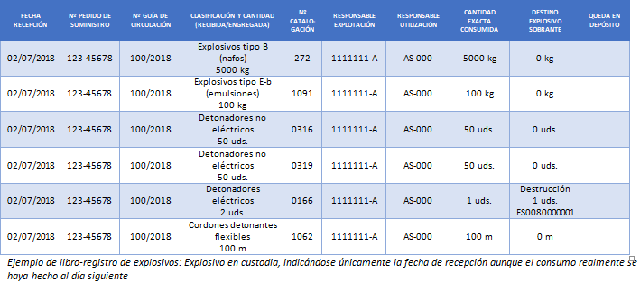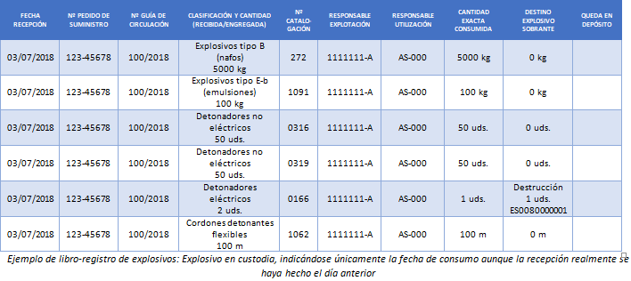 Además puede ocurrir que, justo en el intervalo de tiempo en el que el explosivo está en custodia, la Guardia Civil decida efectuar una comprobación del Libro-registro de consumo, que acorde con el Reglamento, deberá estar actualizado en todo momento. Por un lado, si ya está cubierto según lo expuesto, se está ‘adelantando’ una información que no es posible asegurar hasta que la voladura haya transcurrido. Por otro, podría estar todavía en blanco y por tanto no estar reflejada la recepción. Lo más coherente parece entonces rellenar sólo las primeras columnas sin indicar el destino del explosivo hasta que no se haya efectuado el disparo, pero entonces hay quien puede considerar que los asientos están incompletos.