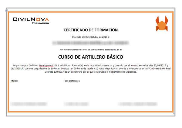 CivilNova Formación ha impartido estos días el primer curso de formación de artilleros en Asturias bajo las premisas del nuevo Reglamento de Explosivos, que entró en vigor a principios de este año. Hay que recordar que nuestra empresa está homologada oficialmente para impartir este tipo de cursos y que además está acreditada para impartirlos, si son susceptibles de ser bonificados, con cargo a las cuotas de la Seguridad Social de la empresa.
